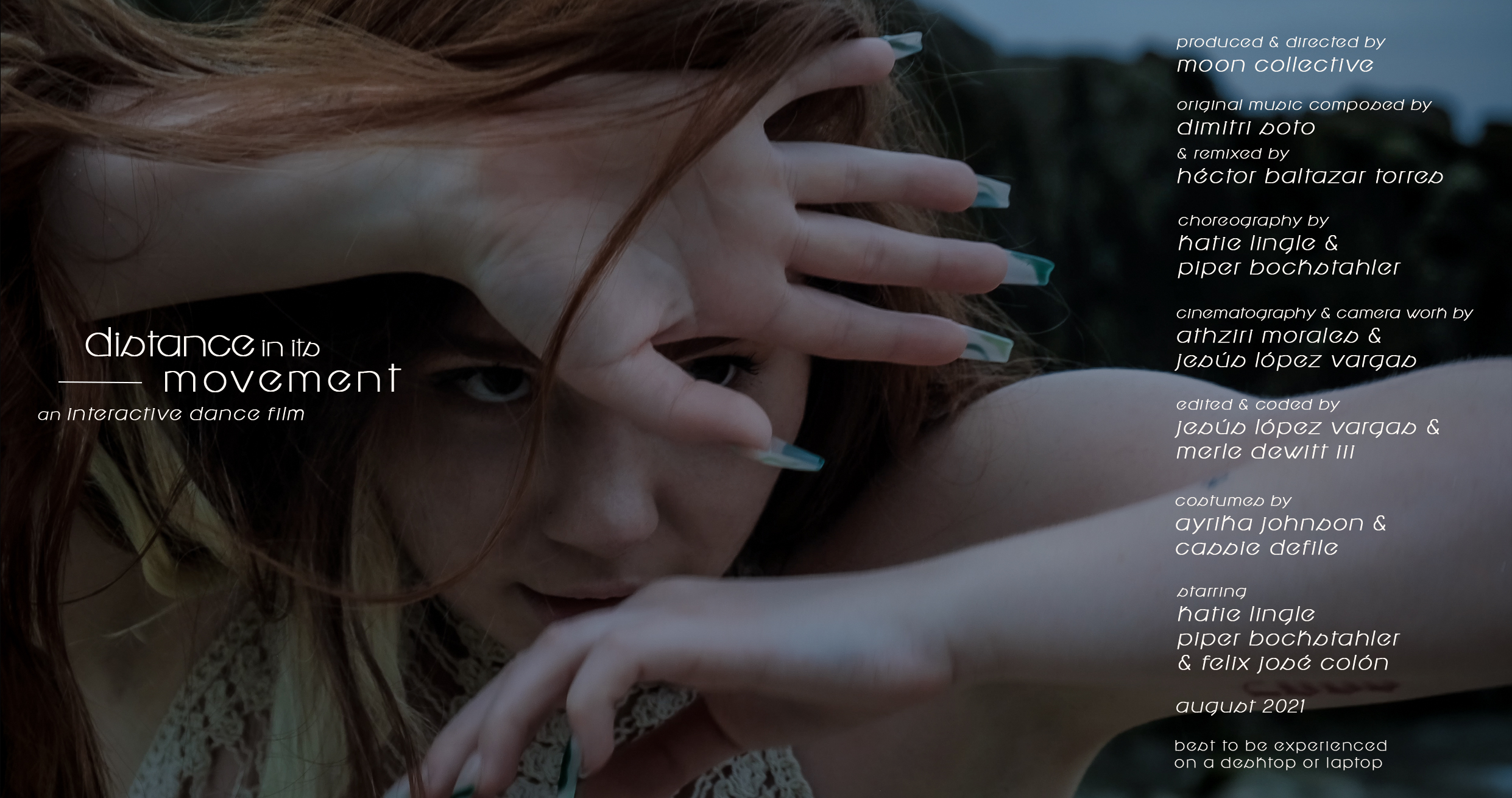 Distance in its Movement is an interactive dance film, in which movement takes form not only within the limitations of a dancer's body. Choreography can be defined as an arrangement or sequence of steps and movements - our project takes this definition, expands it, and challenges all creative elements within it to be composed as a collage in a permanent state of movement, where stillness in a body can exist as movement around it persists. Distance in its Movement also invites its audiences to join in its continuous shaping, actively engaging with the choreography from beginning to end. One gets to decide the final form of these movements and their distance.